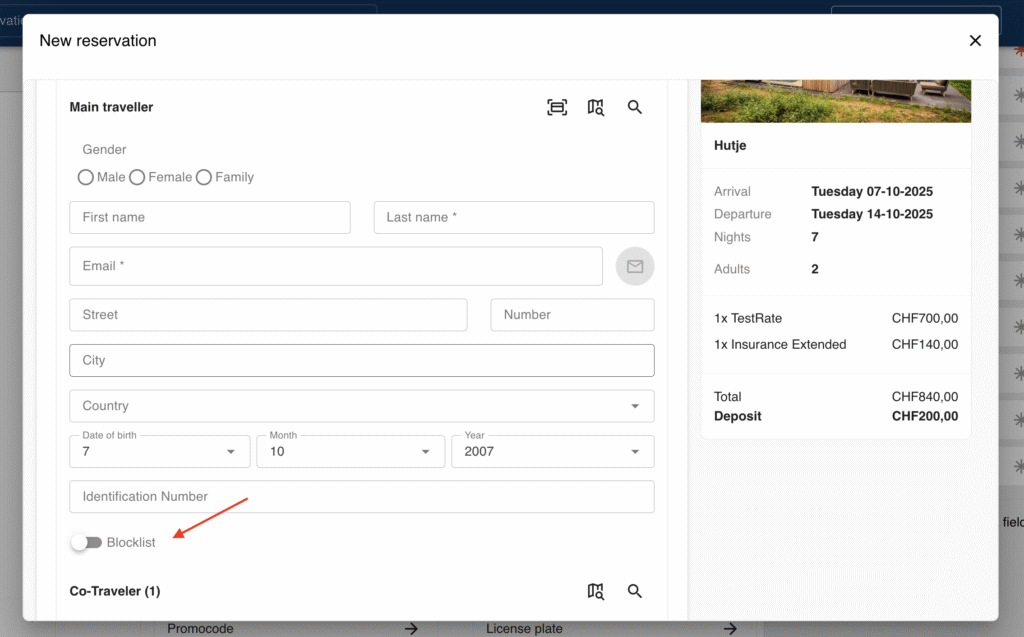 During the Creation of a New Booking: When creating a new booking, the on/off field for the guest to be added to the “blocked” list will be visible alongside the Main Traveler’s details.