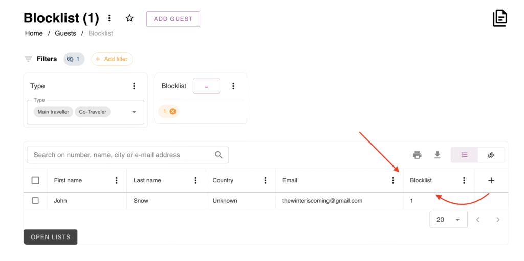 With this configuration, all guests with the blocked tag associated will appear in this new report.