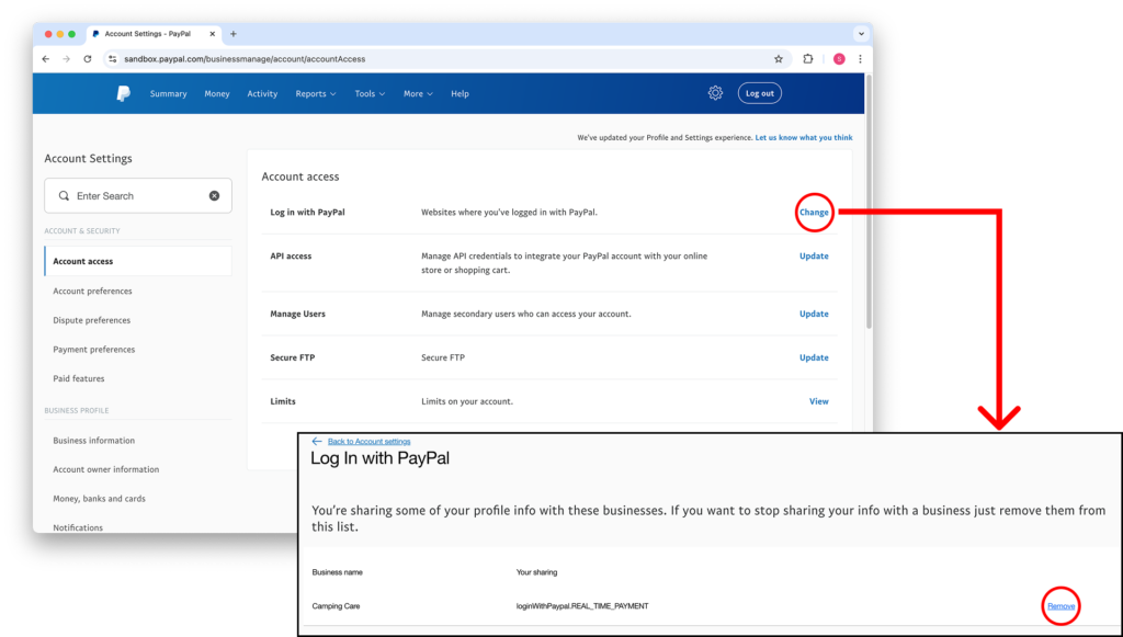- Under ‘Account access’ you will see a ‘Log in with PayPal’ section, click on ‘Change’.