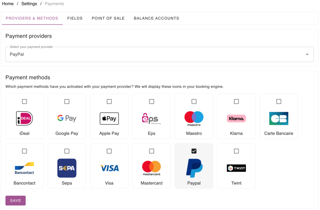Now in your Camping Care settings go to Payments > Providers & Methods and select the ‘PayPal’ provider in the dropdown menu. Select the PayPal icon and click ‘Save’.